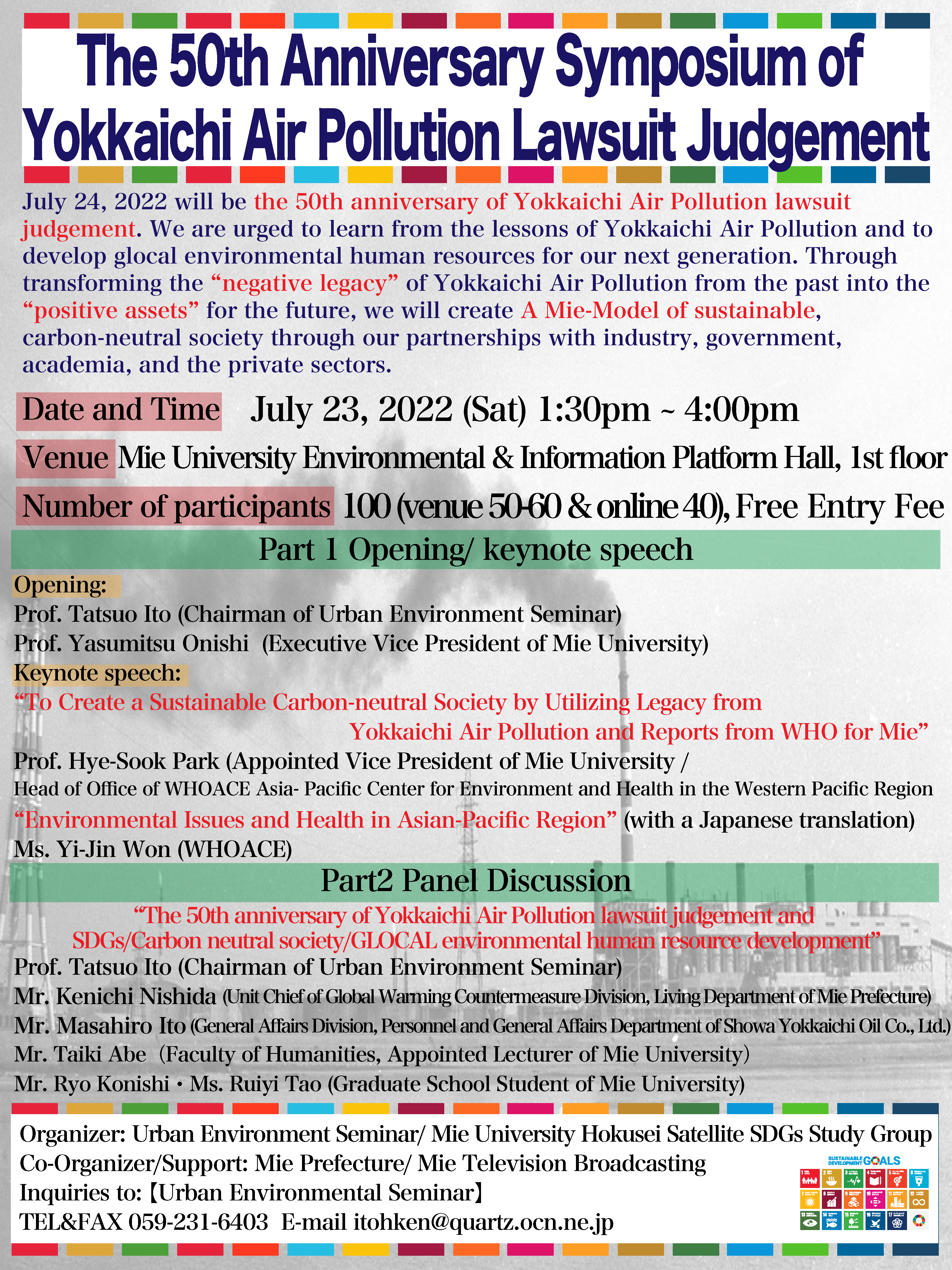 2022年7月23日(土)に、三重大学北勢サテライト「SDGs研究会」と都市環境ゼミナールとの主催、三重県・三重テレビ放送の後援で、三重大学国際環境教育研究センターにて、「四日市公害訴訟判決50周年シンポジウム」を対面・オンラインのハイブリッド形式で行いました。