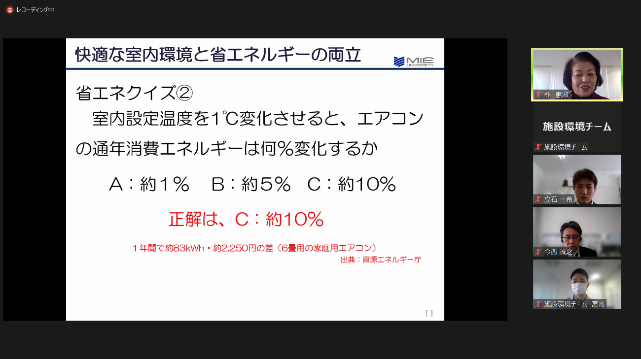 1月27日(木),教職員を対象に「省エネおよび環境マネジメントシステム研修会」をオンラインで開催しました。本研修会は,環境マネジメントマニュアルに基づき行われ,各部局の環境責任者・副環境責任者・ユニット環境担当者・ECOキーパー等,教員・職員あわせて,81名が参加しました。
