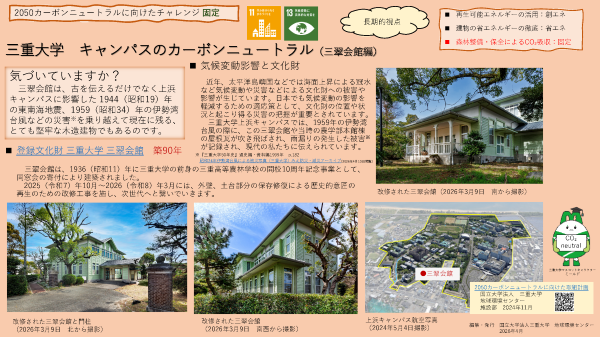 これまでの登録有形文化財三重大学三翠会館の長期利用による環境負荷の軽減(炭素固定)への取り組みや気候変動影響・激甚化する災害への対応を継続しながら、2050カーボンニュートラルに向け、「建物の省エネルギーの徹底:省エネ」等の本学の取り組みを推進していきます。